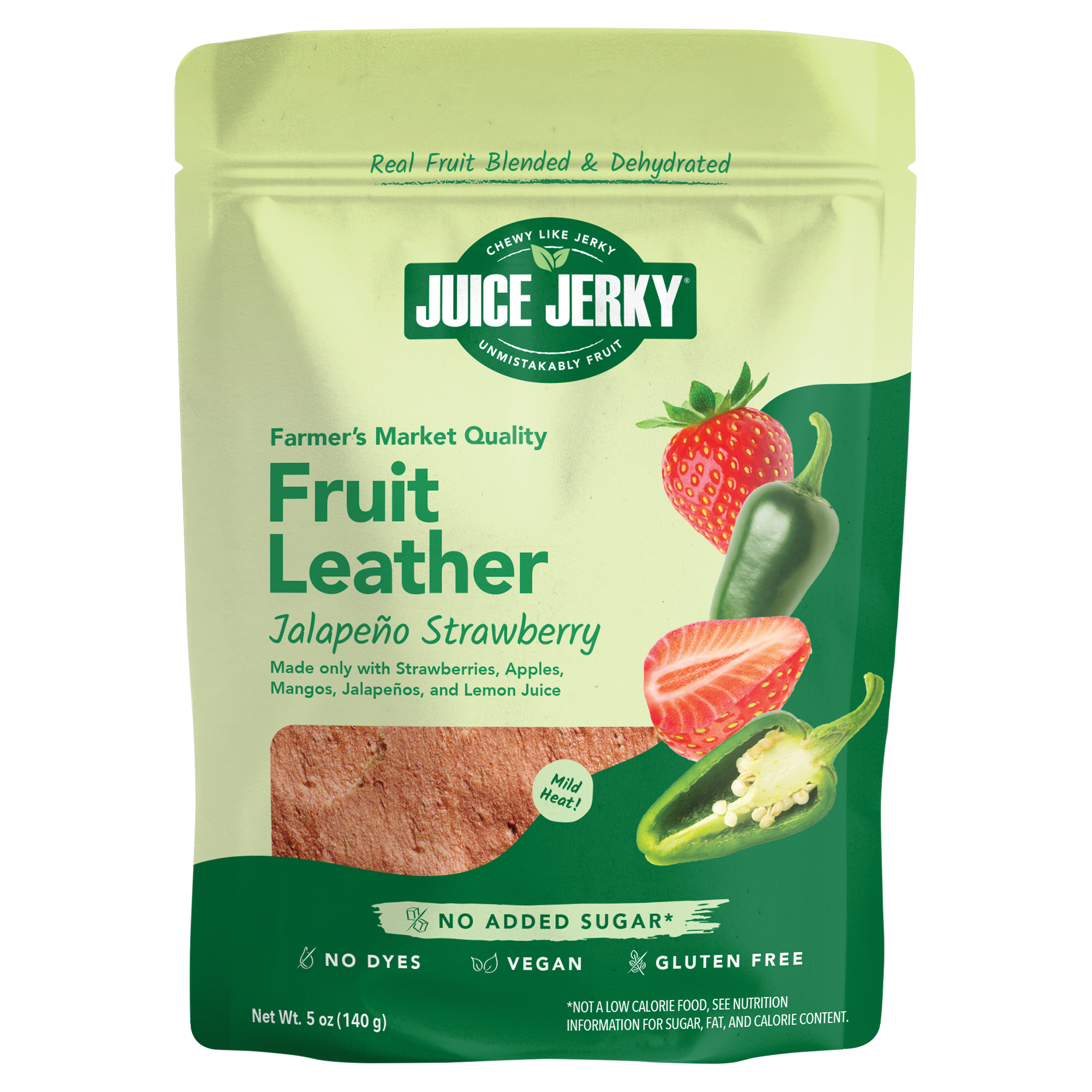 This is our version of a fruit leather but it’s chewy like jerky. It’s made with 100% real fruit and has no other ingredients. There’s no added sugar, artificial preservatives, dyes or gelatin. It’s blended and dehydrated, so it maintains the majority of the nutrients fiber and antioxidants. And It’s naturally vegan and gluten-free.