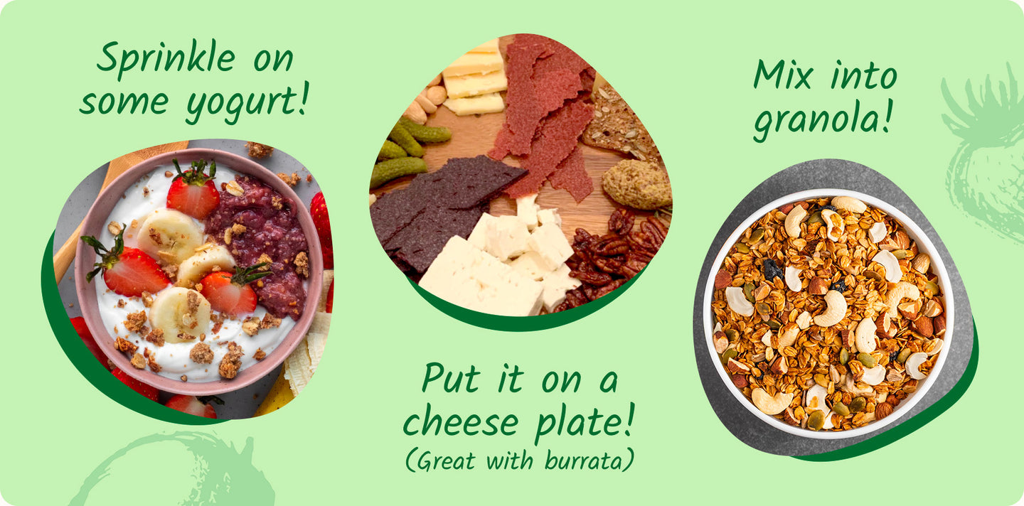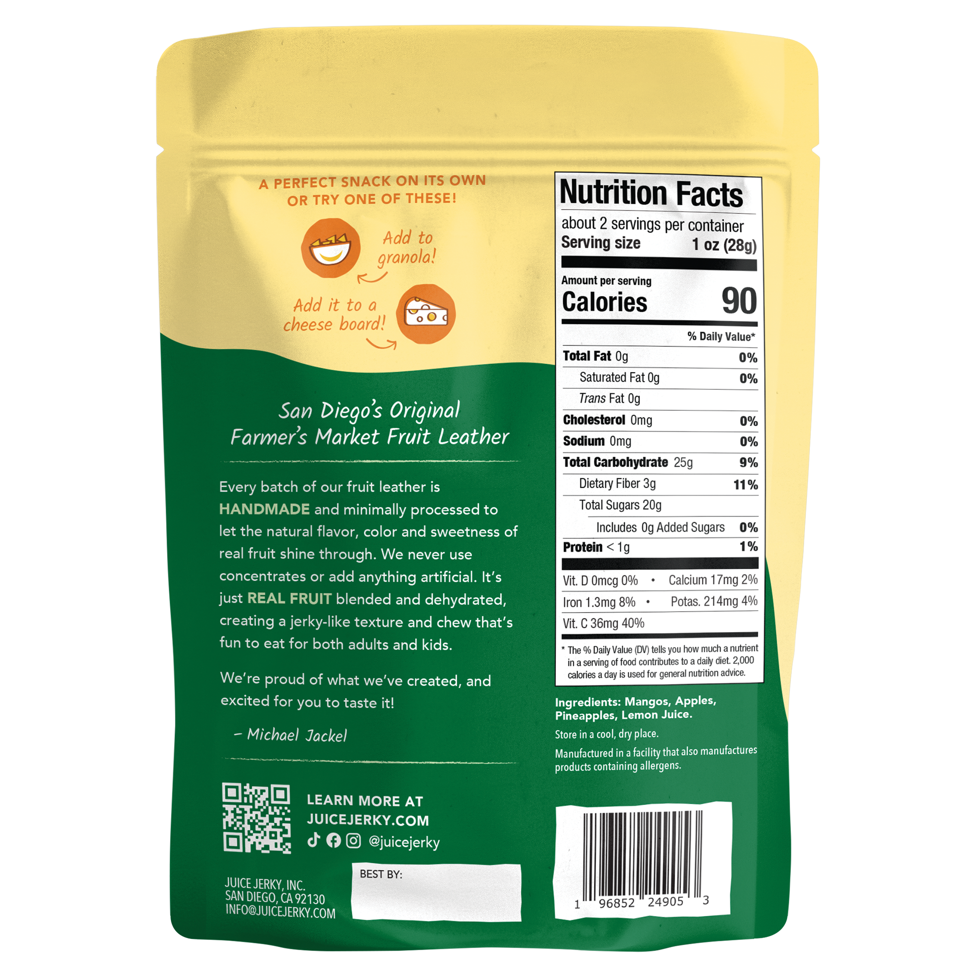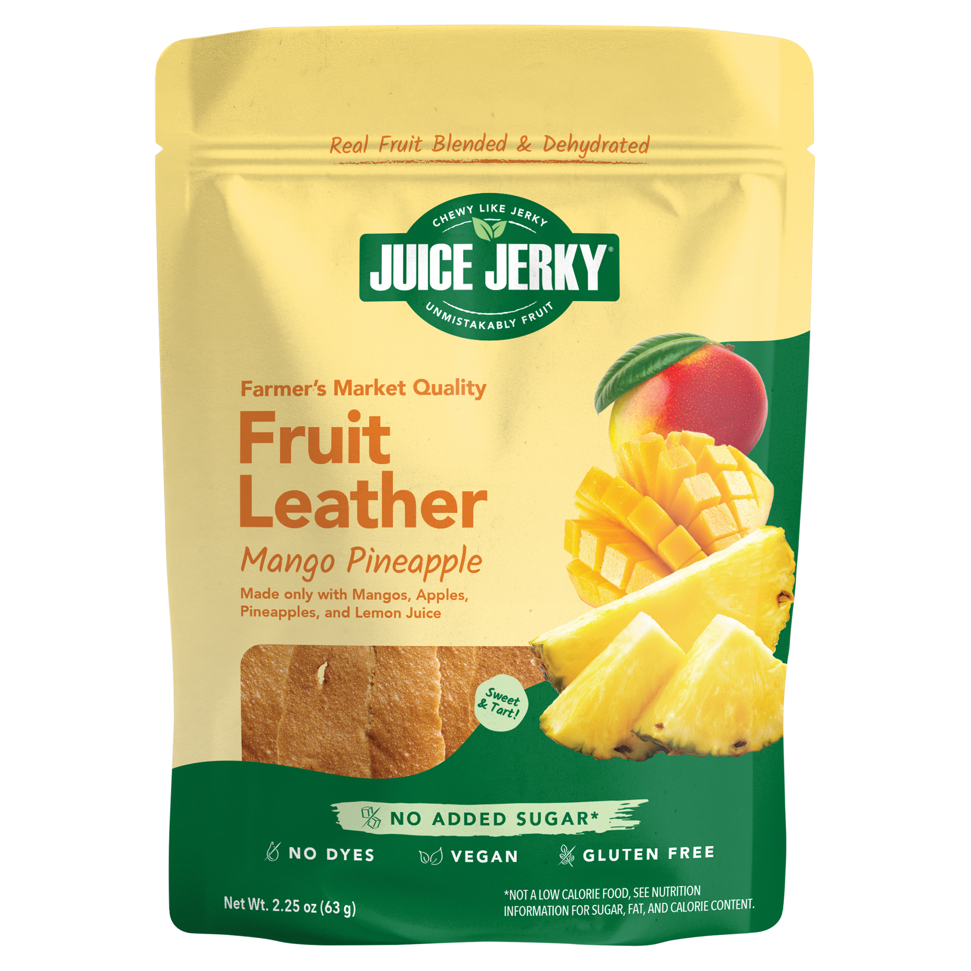 This is our version of a fruit leather but it’s chewy like jerky. It’s made with 100% real fruit and has no other ingredients. There’s no added sugar, artificial preservatives, dyes or gelatin. It’s blended and dehydrated, so it maintains the majority of the nutrients fiber and antioxidants. And It’s naturally vegan and gluten-free.