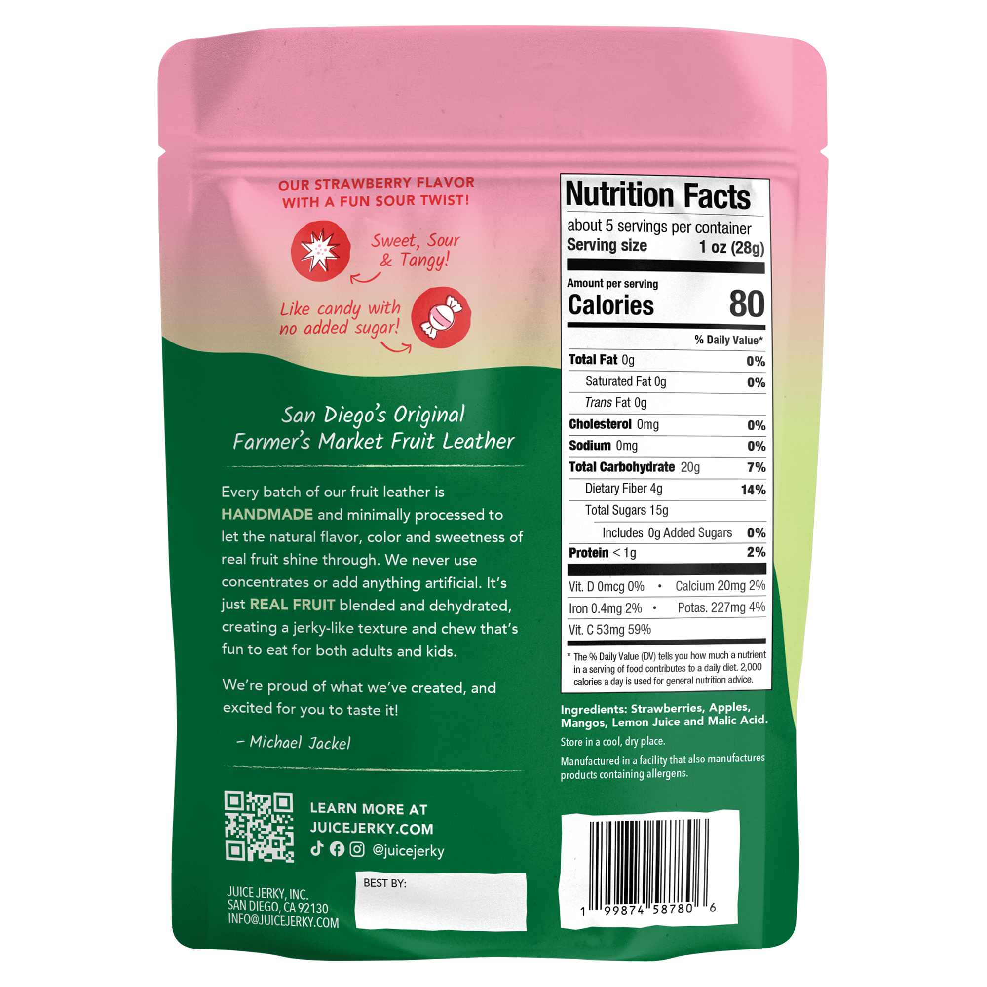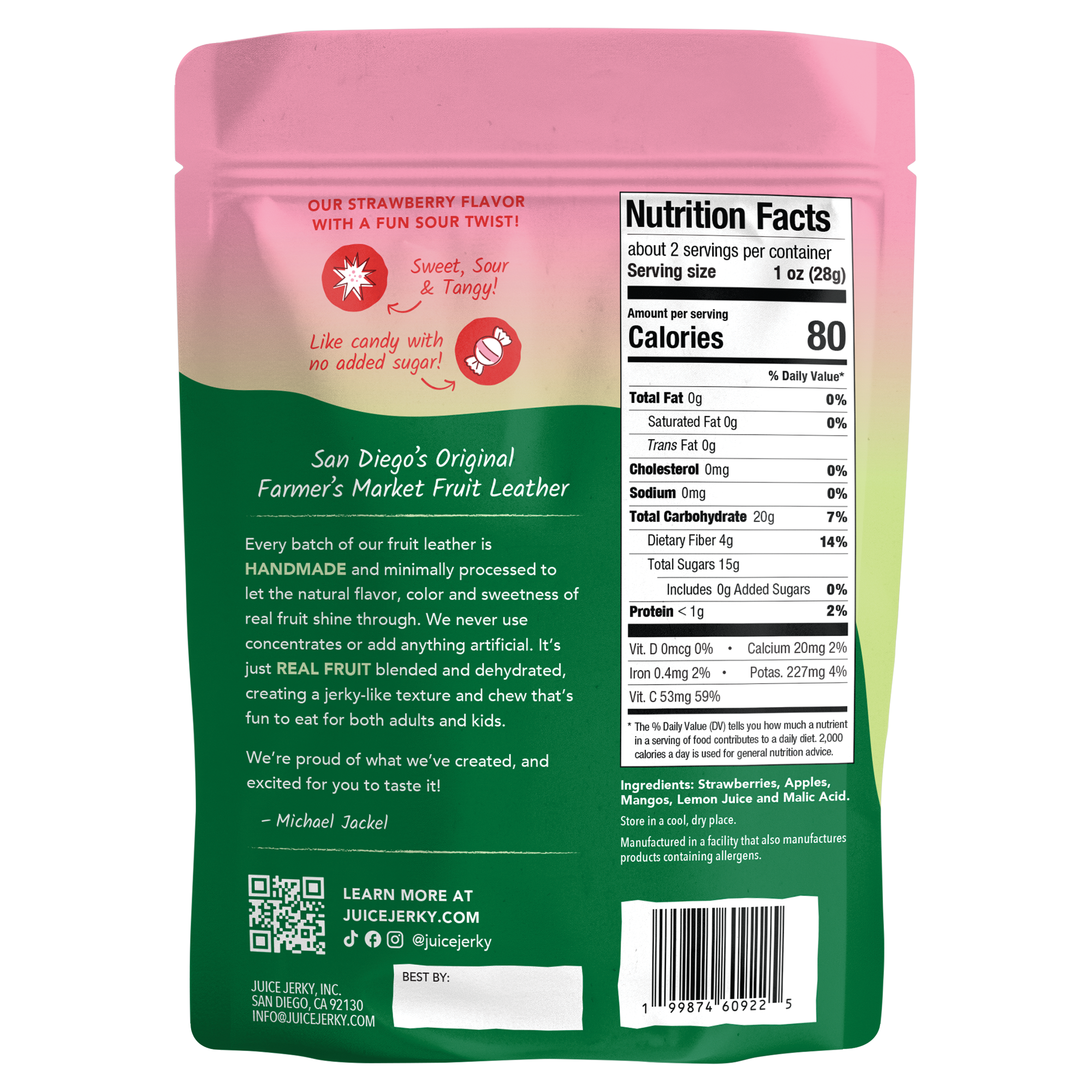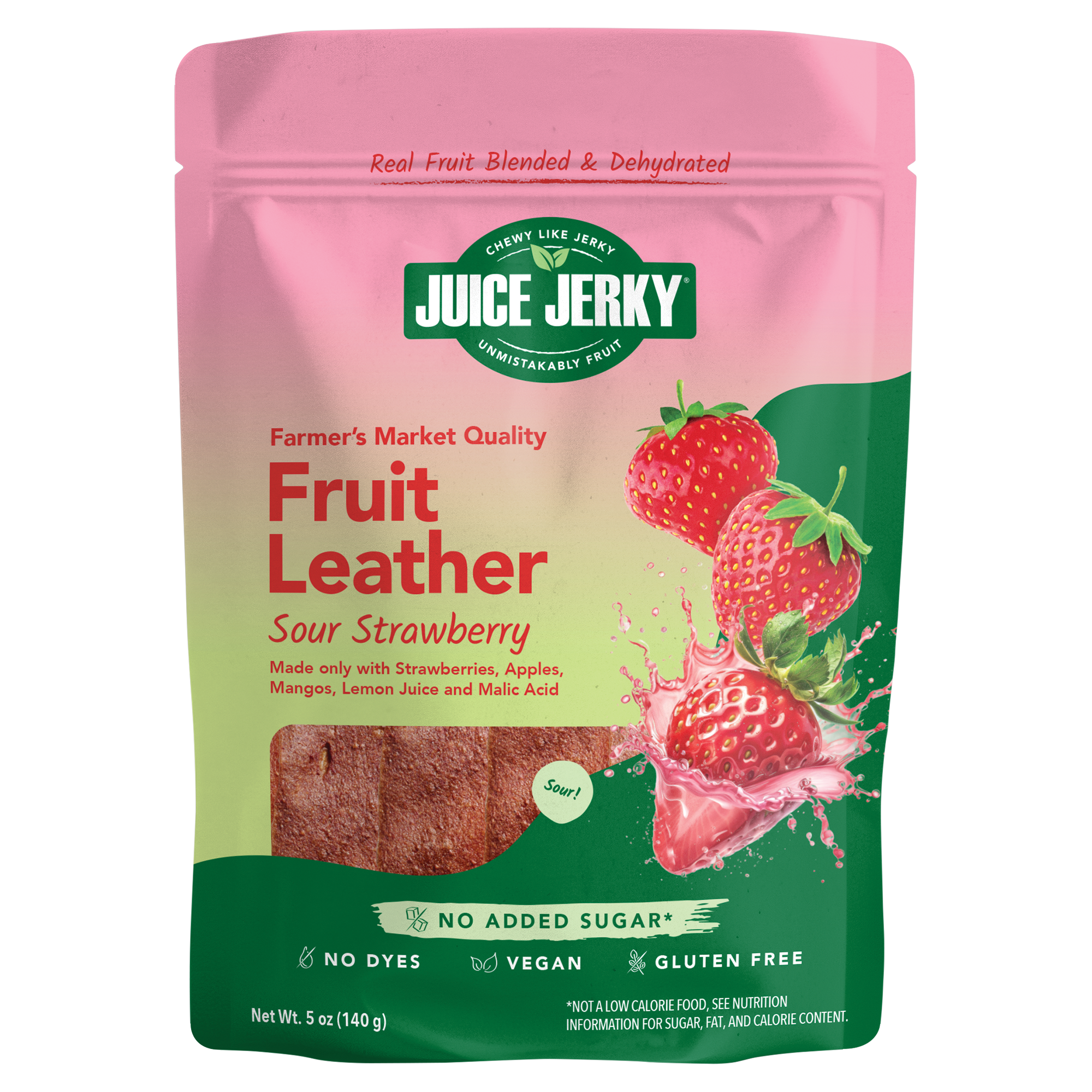 Try our new sour flavors! Sour candy vibes, real fruit ingredients. Our Sour Strawberry Juice Jerky is chewy, tangy, and made with 100% fruit and no added sugar.